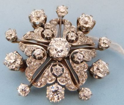 A gold and platinum pendant or brooch set with diamonds in a stylised flower cluster, the central diamond of approximately 0.8ct surrounded by diamond encrusted decoration and ten further larger diamonds to the outer edge (total weight approx 4ct) (Please announce 0.8ct not 0.9ct)