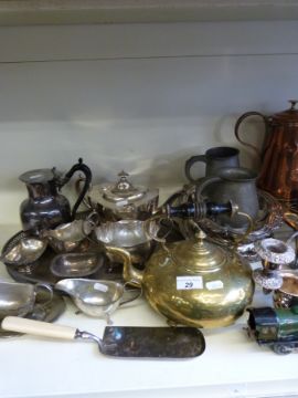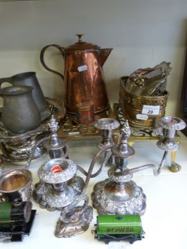 A quantity of silver plated ware including candelabra, tray, teaware, brass ware, Hornby Dublo