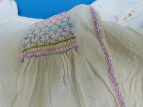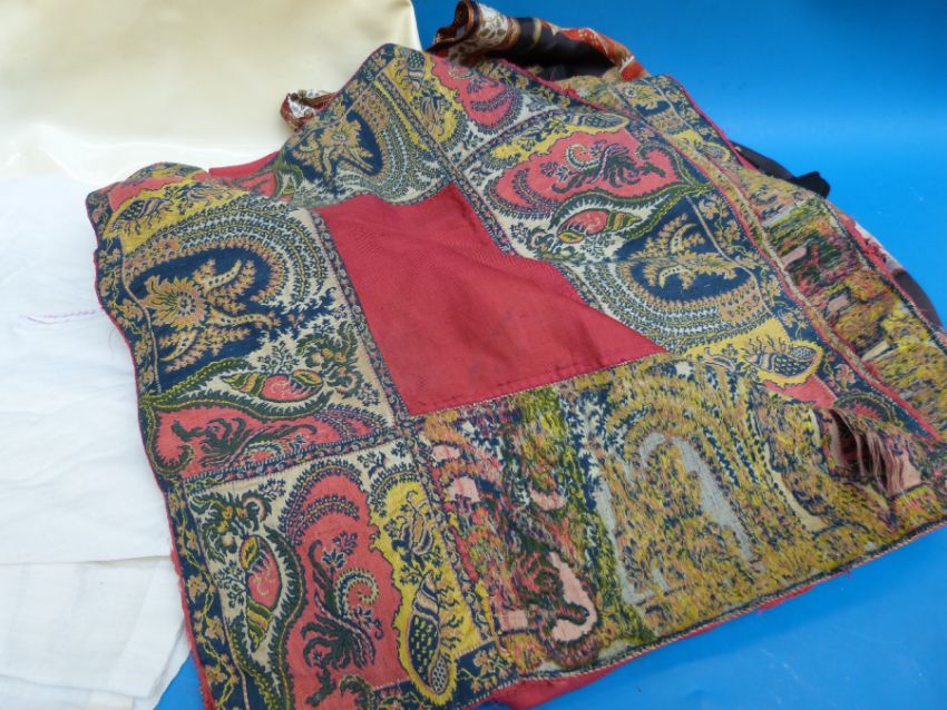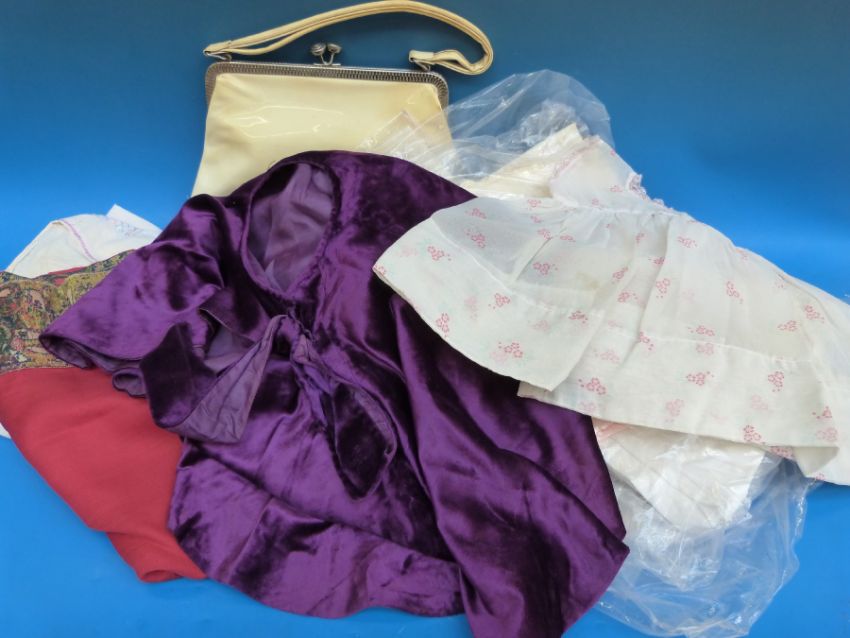 A collection of vintage textiles to include lace, dresses, children's clothing, embroidered shawl etc