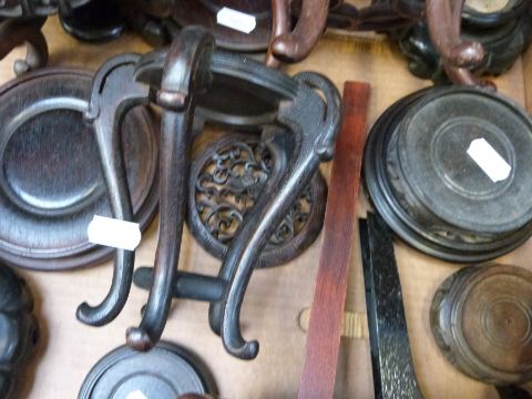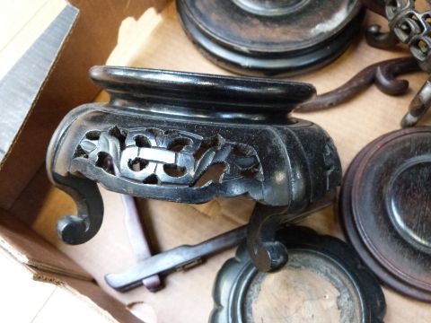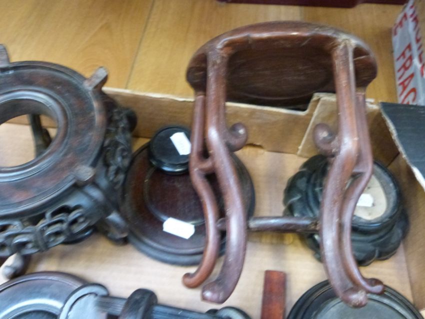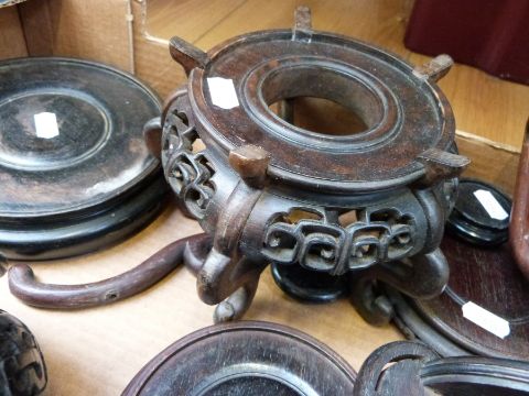 A collection of Chinese and Oriental hardwood stands including some shaped, carved and reticulated examples
