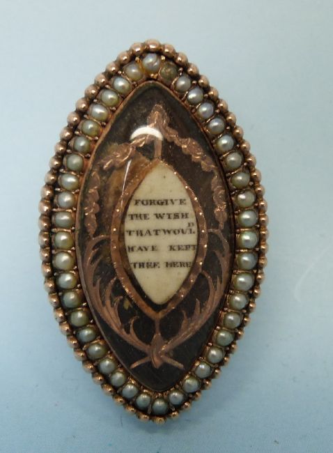 A Georgian mourning brooch decorated with hair with gold decoration and a small bone section to the centre inscribed "forgive the wish that would have kept thee here" and engraved to verso "J Rimmington Obt 8th Nov 1785 at 27"