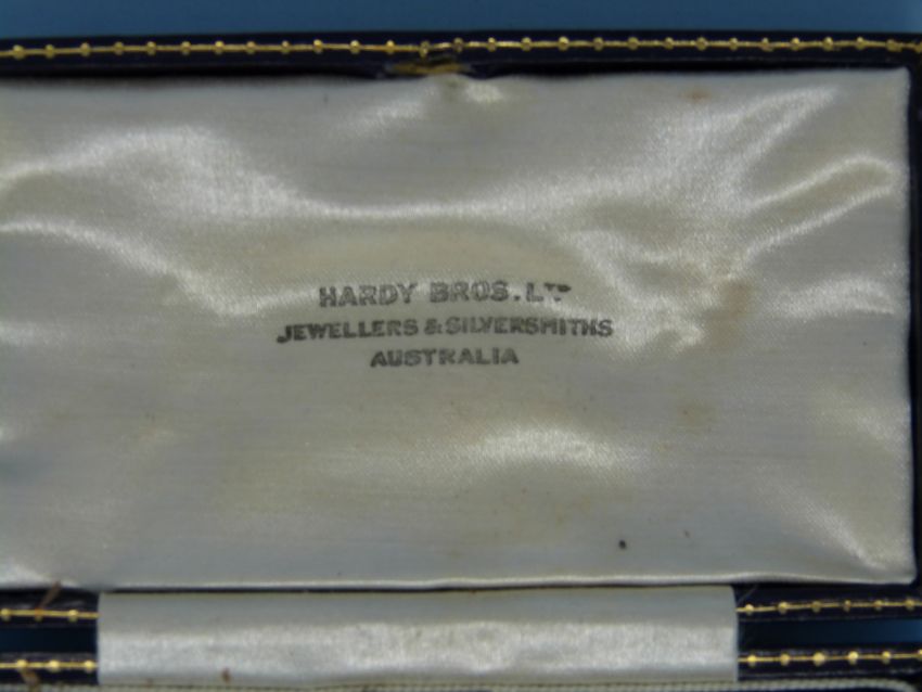 A gold stick pin set with turquoise in the shape of a horseshoe with a seed pearl to the centre (in original box for Hardy Bros, Australia)