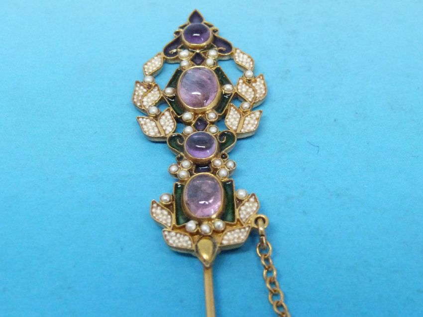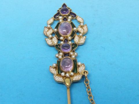 A Diego Percossi Papi designer stick pin set with seed pearls and amethysts amid green and purple enamel decoration
