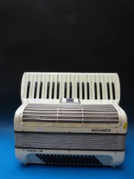 A c1960 Hohner Tango IM with 96 bass two voice treble, in ivory pearloid finish with case