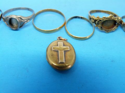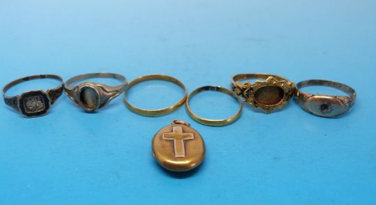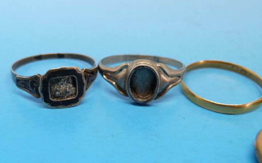 A small collection of rings to include two high grade wedding bands (marks rubbed), a hallmarked 18ct gold mourning ring inscribed 1863, a 9ct gold ring and a mourning locket with a cross to the front