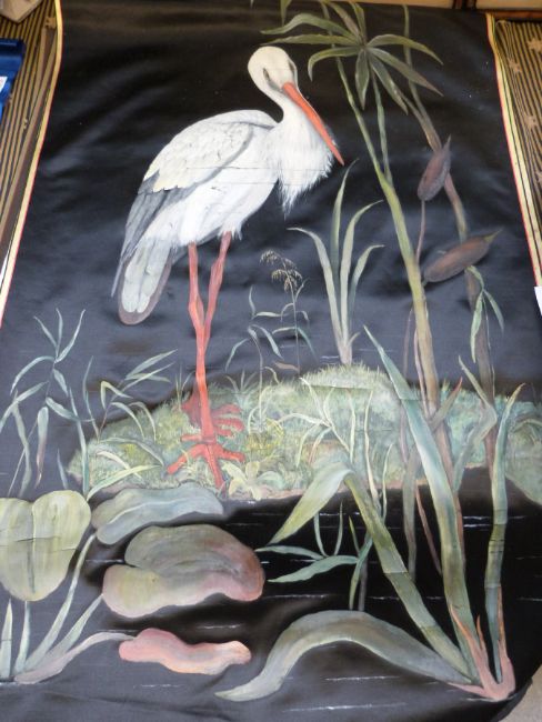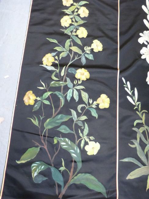 Three Oriental silk wall hangings with hand painted decoration of lillies, hibiscus and a heron