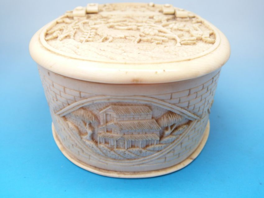 An oval ivory casket with hinged lid carved with deer in a wooded landscape, the sides with vignettes of buildings, length 11.5cm