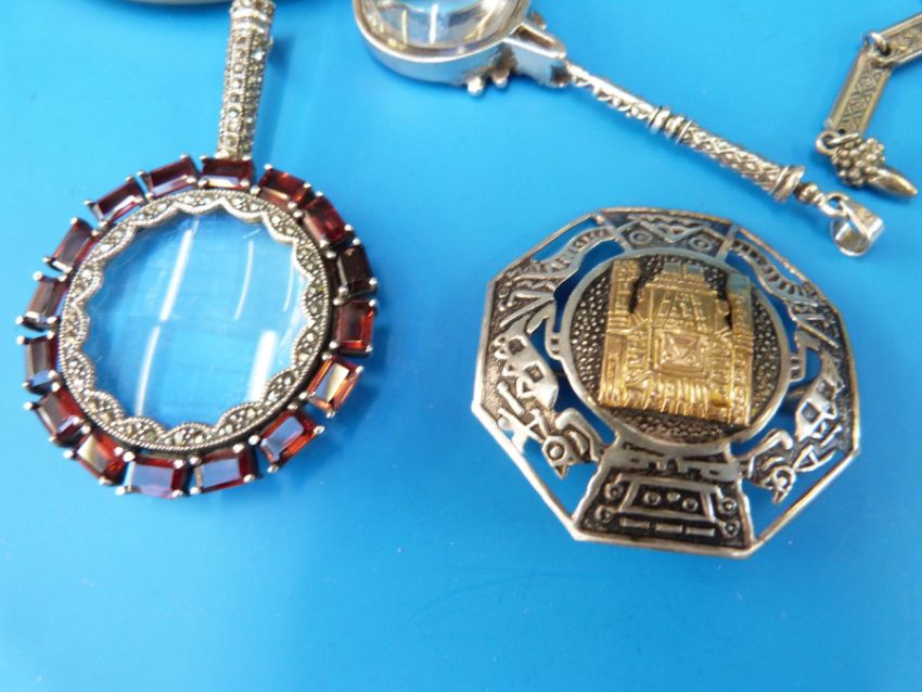 A quantity of white metal and silver items to include brooches, magnifying glasses, necklaces etc