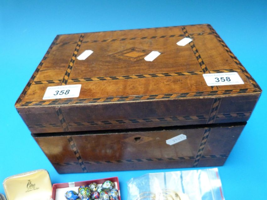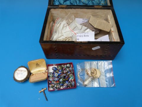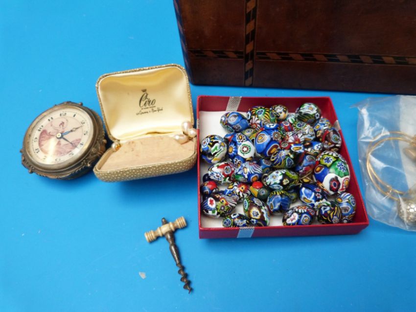 A collection of jewellery to include faux pearls, millefiori beads, earrings, brooches etc, all in an inlaid wooden jewellery box