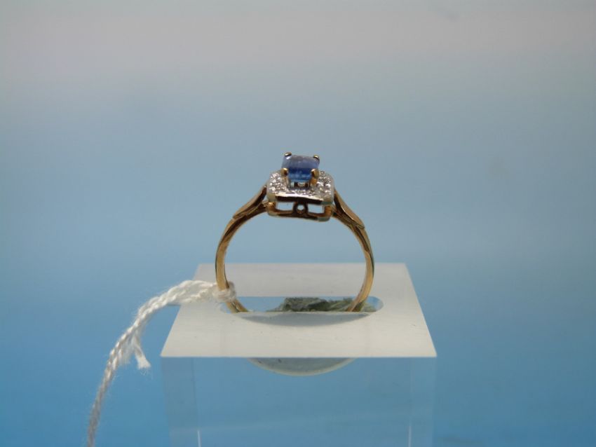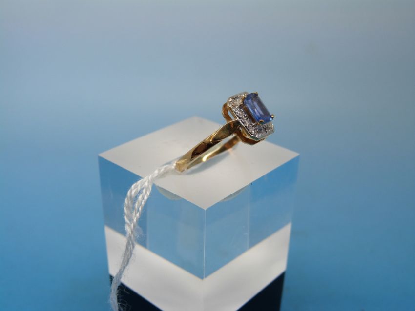 A 9ct gold ring set with an emerald cut topaz surrounded by diamonds (size M)