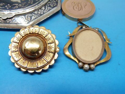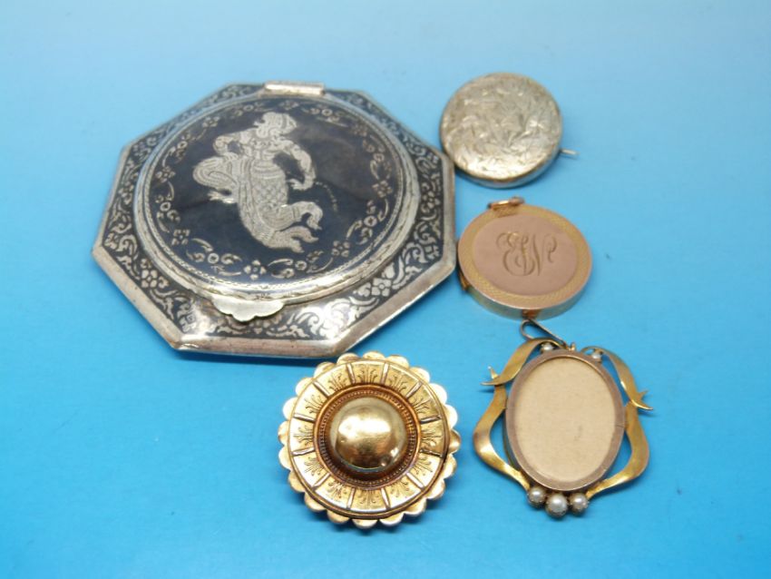 A white metal Japanese compact, white metal brooch, yellow metal locket set with seed pearls, hallmarked 9ct gold locket and yellow metal mourning brooch