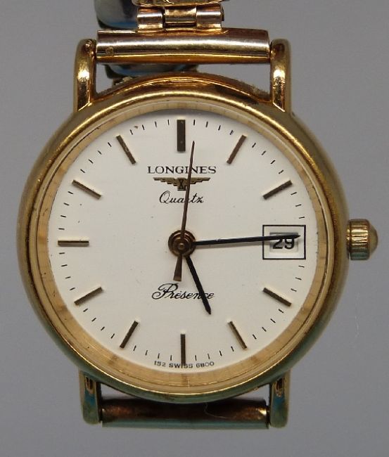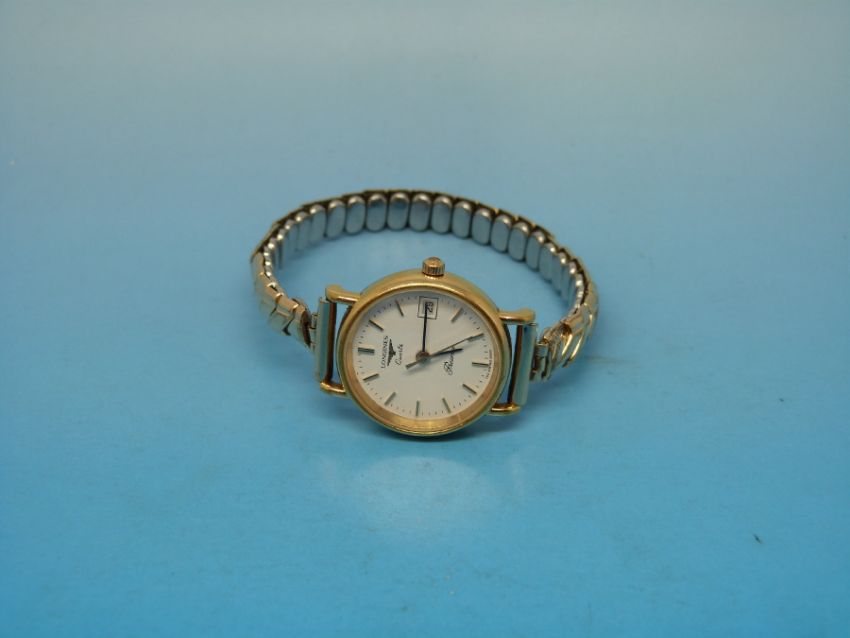 A Longines Presence quartz ladies' wristwatch with date aperture on white face with gold plated hands and hour markers on expanding bracelet.