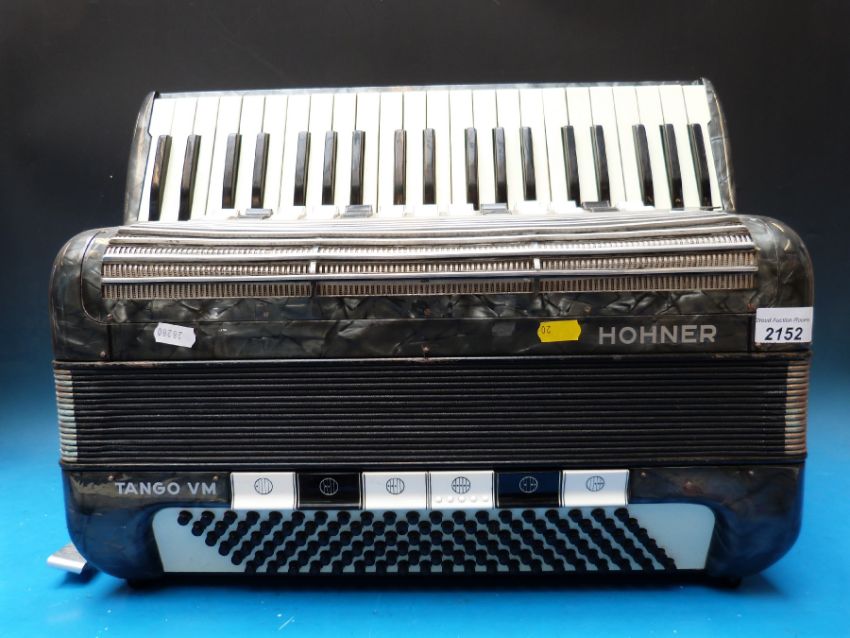 A Hohner 'Tango' VM, c1970 120 bass four voice treble, five voice bass piano accordion, in grey pearloid finish (with case)