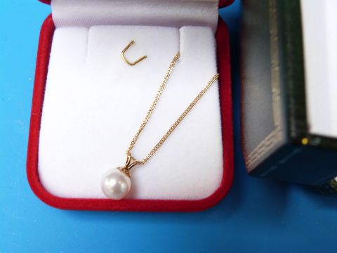 Two 10K gold pendants and chains, one set with an amethyst and one a pearl, a silver chain and pendant and a silver brooch
