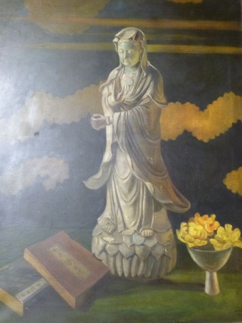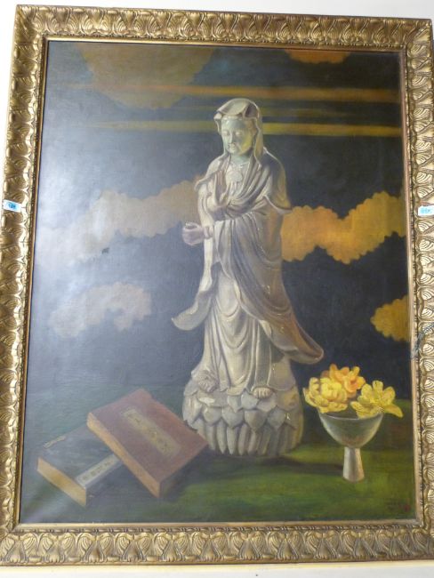 Countess Ingegerd Ahlefeldt Laurvigen: Oil on canvas still life "The Keeper of the Secret" of Guanyin books and flowers, label verso, signed and dated 1933 lower right (113 x 88cm)