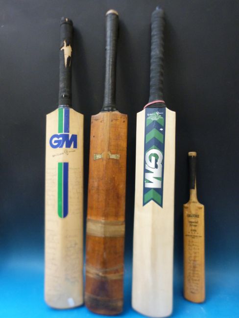 A collection of cricket bats including signed examples and a miniature example by Australian touring team 1956