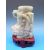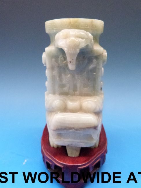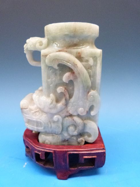 A Chinese jadeite archaistic vase in the form of a dragon, on pierced wooden stand (10.5cm - 13cm with stand)