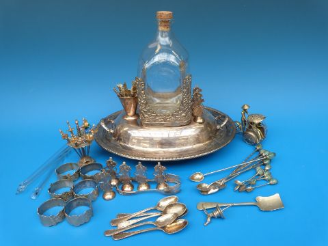 A white metal mounted dimple bottle, mount stamped 800, similarly marked sugar tongs, set of six oynx or agate topped spoons marked 800 and a matching set of smaller spoons, plated entrée dish and other metalware etc