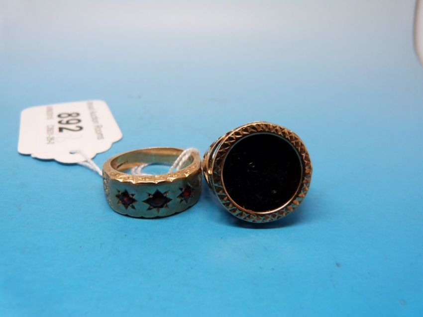 A 9ct gold ring set with three garnets together with a yellow metal ring