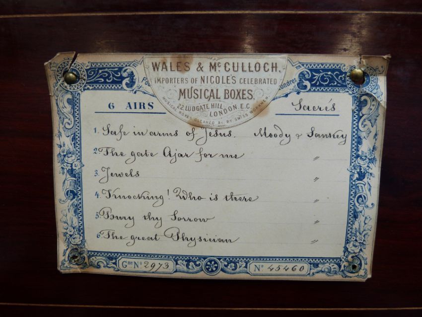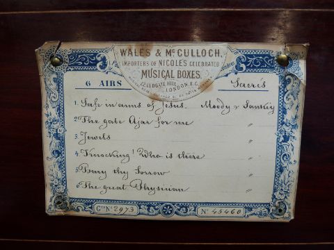 A Nicole Freres six air cylinder music box retailed by Wales & McCulloch with zither attachment, repeat mechanism and stop/start. Nicole Freres stamped to bed plate, ornate inlaid lid with banding. Card tune sheet, gamme number 2973, serial number 45460