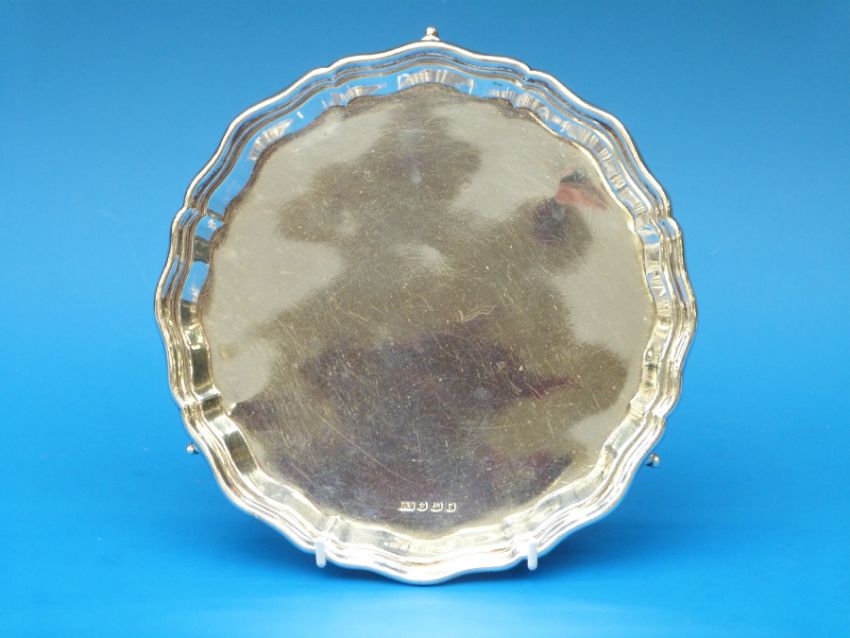 A hallmarked silver salver with shaped edge, raised on three scrolling feet (Sheffield 1934) maker Viner's Ltd (20cm diameter) 320g