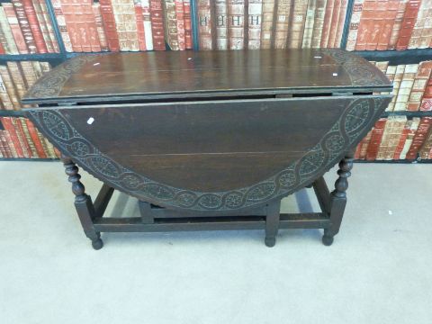 An antique oak drop leaf table with pegged joints, length 122cm
