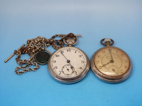 Two keyless wind pocket watches together with two pocket watch chains