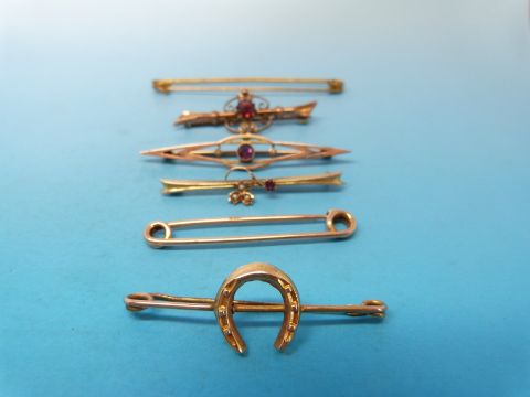 Three yellow metal brooches marked 9ct set with garnets and seed pearls, a yellow metal brooch in the form of a horseshoe and a 9ct gold pin (10.9g)