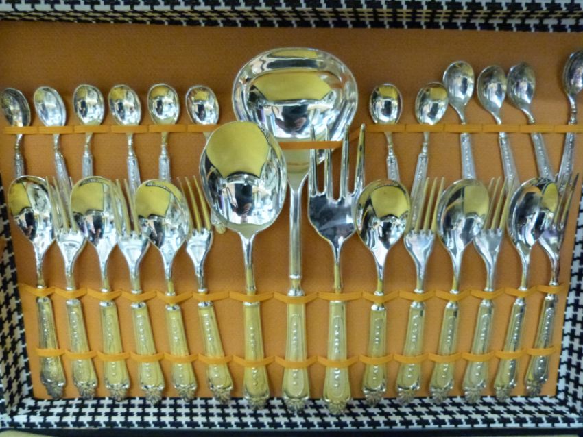 A cased canteen of silver plated cutlery, various loose cutlery and a Royal Albert Masquerade tea set