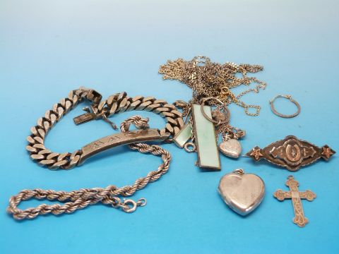 A collection of silver jewellery to include a silver locket, hallmarked silver identity bracelet, a silver bracelet, silver chains, silver pendant etc