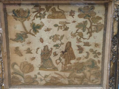 A 17thC embroidery of sweethearts in a garden, the lady playing a flute surrounded by individual insects, flowers, birds and animals within a deep contemporary carved and gilded wooden frame (Embroidery 40 x 46 cm, 50 x 56 overall)