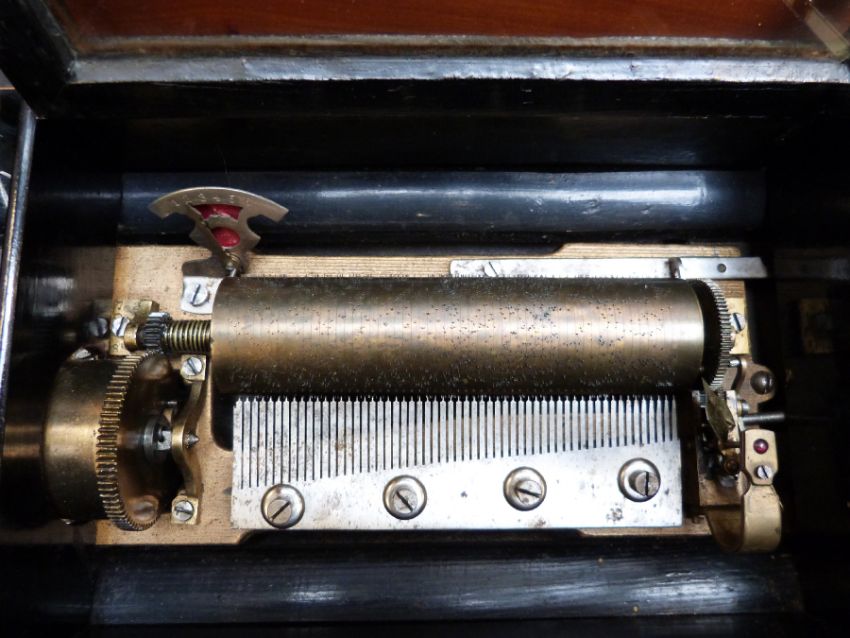 A late 19th century cylinder music box playing six airs with tune indicator, repeat mechanism and stop/start control, serial number 7280. Mechanism on brass bedplate within a case with banding to lid and front and late transfer printed decoration. Made in Switzerland, tune sheet with airs including 'Florodora', 'The Soldiers of the Queen' etc