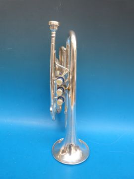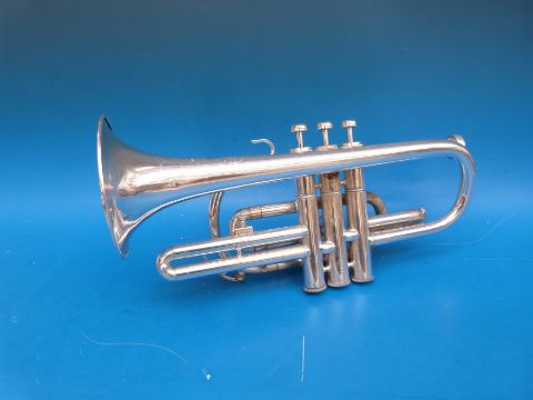 A cased silver plated cornet by Corton, reg no 743501, with two spare mouthpieces