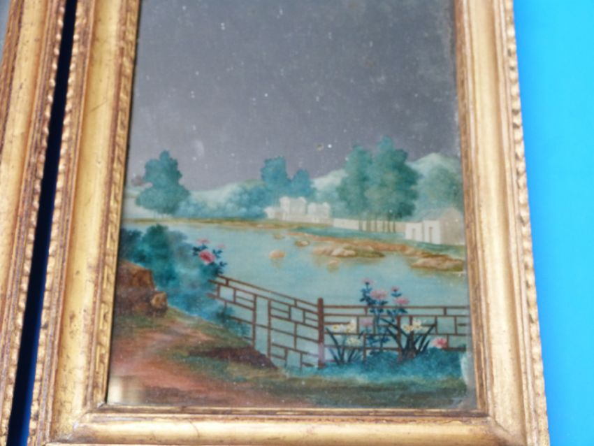Attributed to Spoilum (Guan Zulin) - A pair of late 18th century Chinese Colonial reverse painted mirrors. The first mirror depicts a study of an Oriental lady - possibly of noble heritage judging from her silk clothes highlighted with gilt detail - sitting upon a carpet covered rock and playing with a young child. Visible in the background is a coastal scene with buildings on the shore. The second mirror simply depicts the remaining coastal scene together with an oriental style trellis fence. To the right hand side of the first mirror a single hand can been seen, suggesting that the mirrors were once a larger complete piece. Both mirrors are set in antique gilt frames. Visible mirror dimensions - mirror one 14cm wide x 27cm tall - mirror two 14.5cm wide x 27cm tall. 'Spoilum (Guan Zulin), who lived on Painter's Street, had learned the European method of reverse glass painting. By 1770 he was the largest producer of paintings on glass. His skill lay in his ability to execute precise mirror images of engravings brought from Europe. His portraits were said to sell for $10 each. Such reverse paintings can be seen in many fire temples, with themes from the Shahnameh showing kings holding court or in equestrian pose'. (Williams, 2013, The Everlasting Flame: Zoroastrianism in History and Imagination)