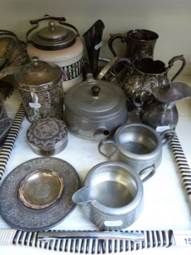 A quantity of silver plated items to include swing handled basket, cutlery, pewter tea set etc, white metal coin based tray marked 925 sterling, (32g) and a possibly white metal trinket box, (112g)