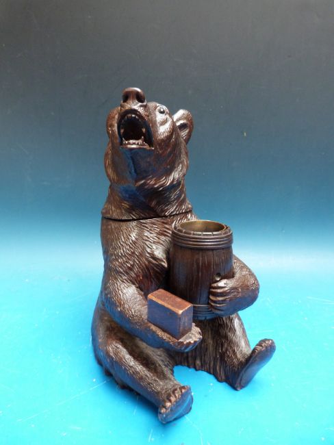 A musical Black Forest carved tobacco container in the form of a bear holding a barrel, the musical box mechanism activated by hanging the head backwards.