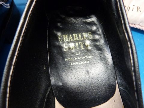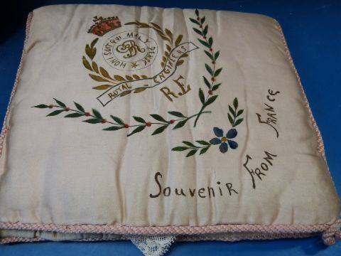 A Royal Engineers WWI painted textile, together with a pair of buckled leather-soled barrister's shoes by Charles Tyrwhitt and a snakeskin handbag