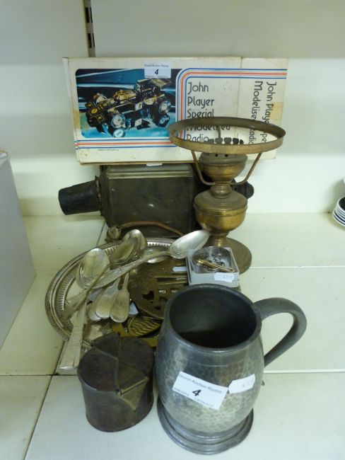 A plated pierced salver, plated serving spoons, a hallmarked silver fob, money box, carriage lamp and a novelty racing car