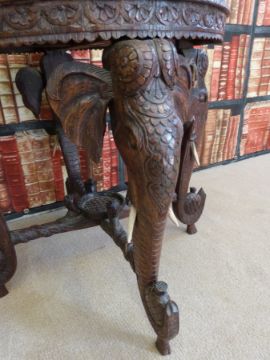 A late 19thC Indian carved side table, the intricately carved top with elephant roundel and a border of exotic animals, legs carved with elephants set with tusks and cross stretchers carved as raised cobras