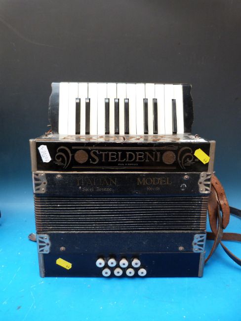 A Mastertone 8 bass German piano accordion c1930, child size keys, together with a similar Steldeni 8 bass model with case both suitable to take out for morris etc w