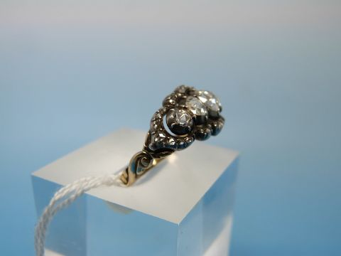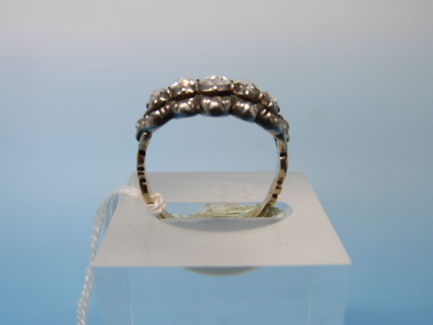 A gold ring set with five graduating rose cut diamonds, the largest of approximately 0.3ct surrounded by a band of further smaller diamonds set in platinum (size O)