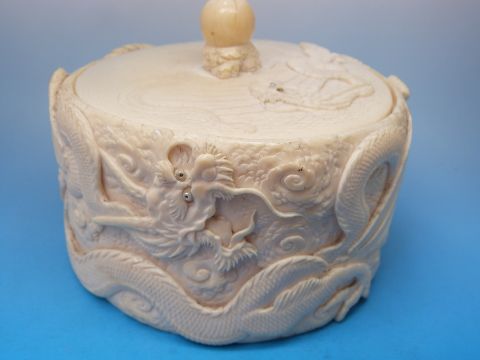 A Japanese ivory box finely carved with scrolling dragons amongst clouds, Meiji period