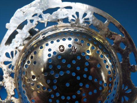 A German white metal tea strainer with eagle atop a column, together with a white metal pepper marked D&H sterling, trinket box marked sterling, a pair of similarly marked sugar tongs (186g) and a pepper grinder marked sterling
