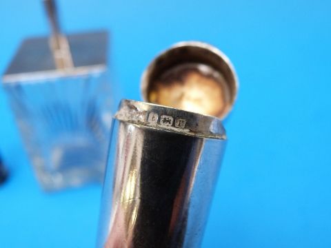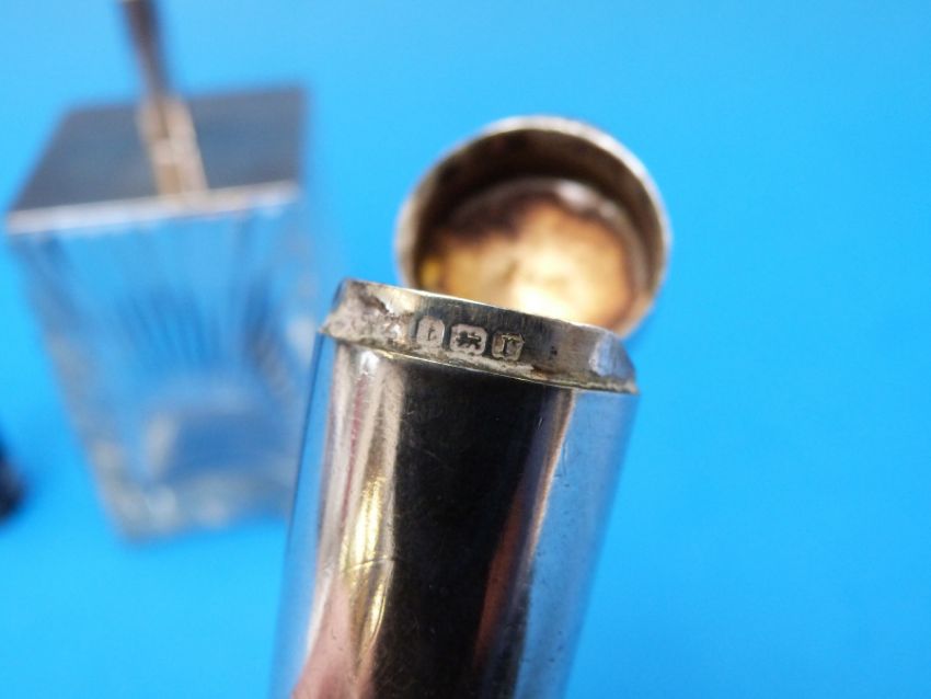 An Art Deco hallmarked silver topped cut glass powder pot, Chester 1931, maker Grey & Co., height 8cm, together with a hallmarked silver cased cigarette holder
