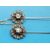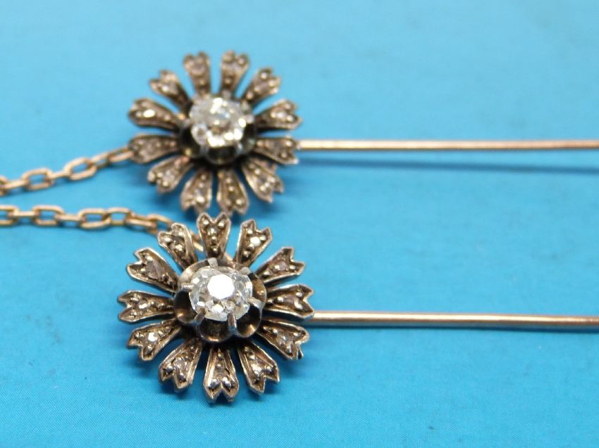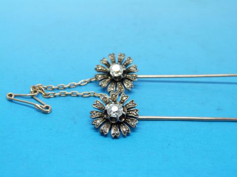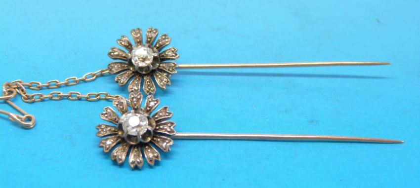 Two matching yellow metal pins, each set with a central diamond surrounded by smaller diamonds in a flower cluster joined together with safety chain