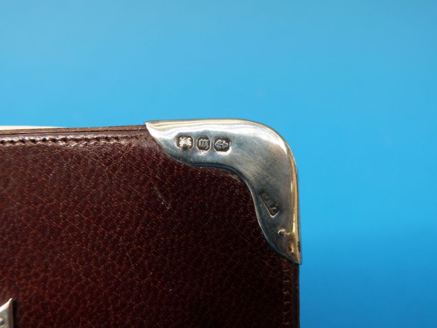 A Victorian leather card case with silver corners and monogram, Birmingham 1896