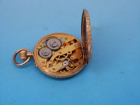 A continental ladies' yellow metal fob watch marked 18k with all over etched decoration, pink enamel chapter ring and blue Roman numerals