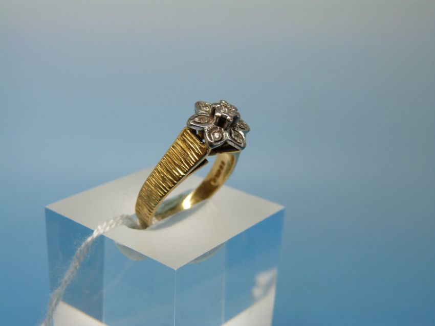An 18ct gold ring set with diamonds in a flower cluster with textured shoulders (size N)