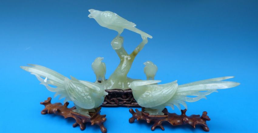 A bowenite model of a bird together with two others on fitted wooden stands