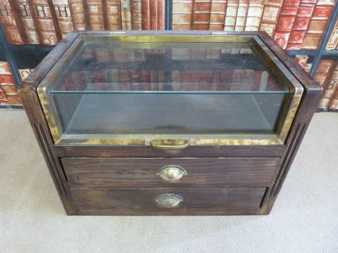 A haberdashery shop counter top display cabinet with lift up glazed top and two doors below (W67cm x D41cm x H48cm)